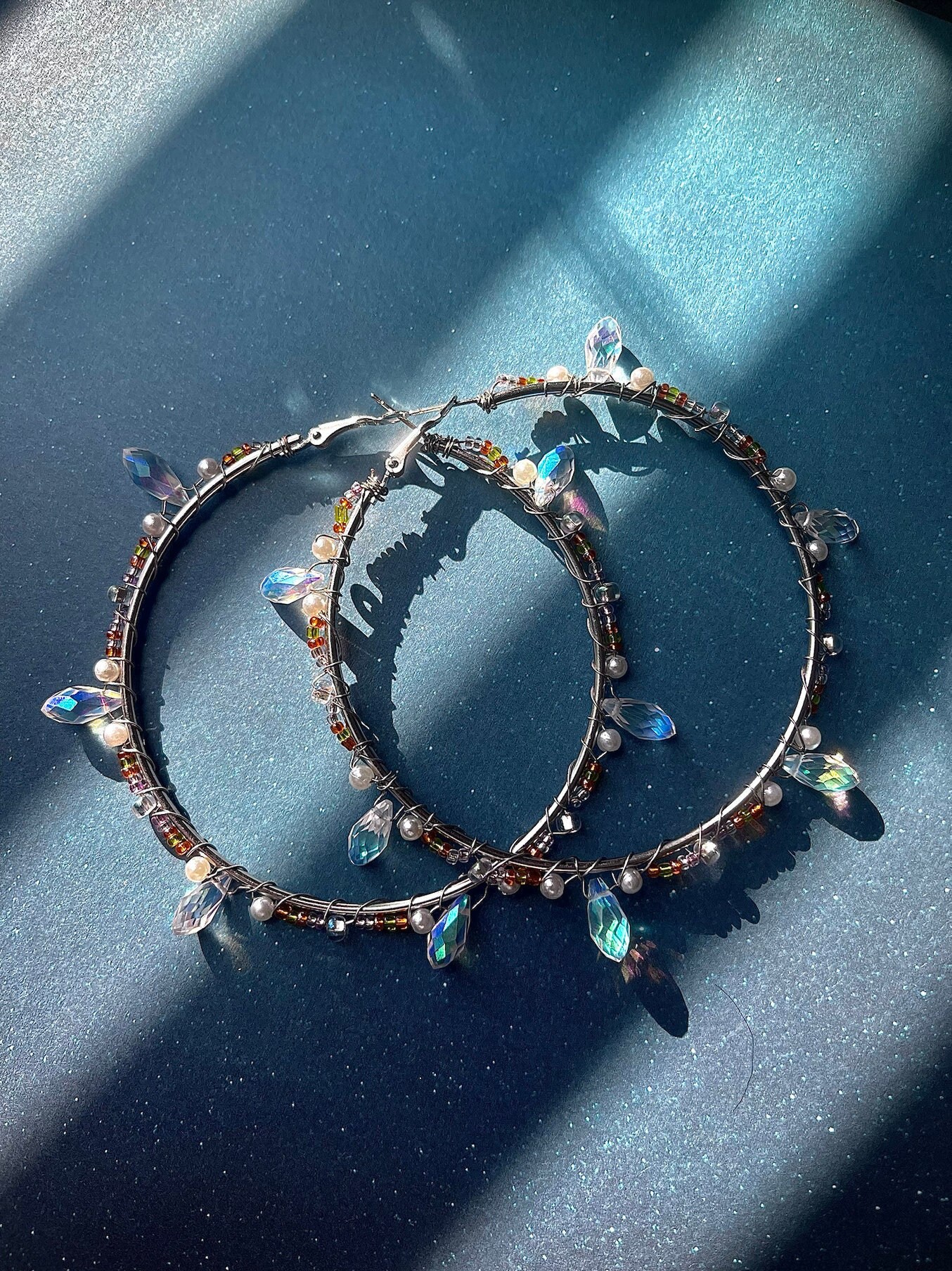 Elevate your style with these stunning handmade XL Sunrise Hoop Earrings! Crafted with love and attention to detail, these oversized hoops feature a mesmerizing array of iridescent crystals, shimmering pearls, and colorful beads, capturing the radiant hues of a sunrise. The lightweight yet durable design ensures all-day comfort, making them perfect for special occasions or everyday elegance. Each pair is unique, with dangling teardrop crystals that catch the light beautifully.
