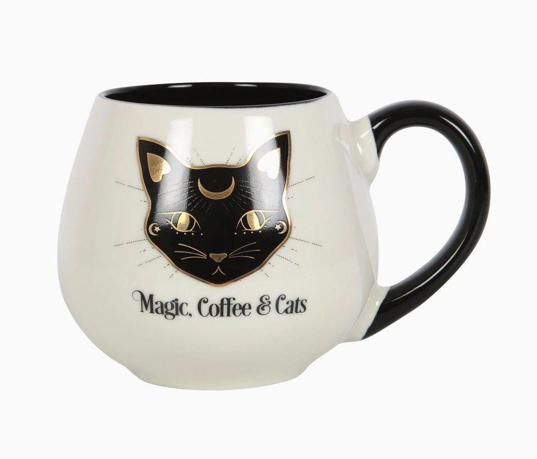 This magickal mug makes a great addition to any witch's kitchen. Features a mystical black cat design with gold tone accents and 'Magic, Coffee & Cats' text. 500ml capacity. Do not microwave. Hand wash only.