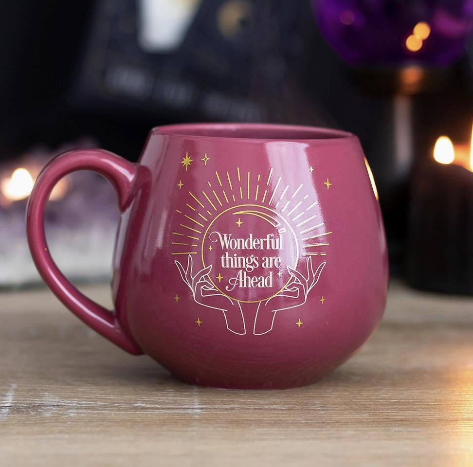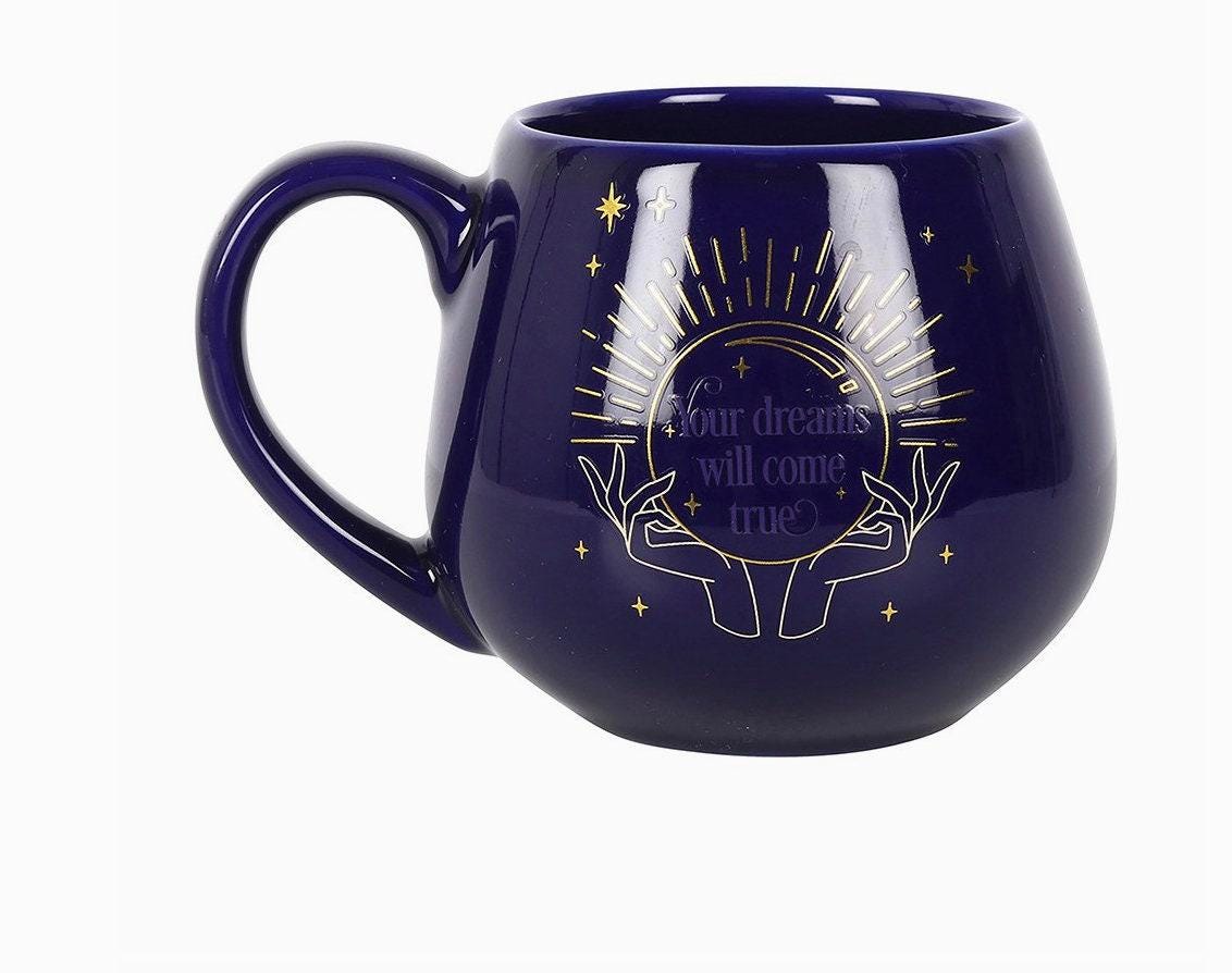 Add a hint of extra magic with every warm cup of tea. This rounded mug features a captivating colour change design that reveals a hidden fortune within the mystical crystal ball after a warm beverage is added. Hidden text reads, 'Your dreams will come true' on a blue base. Holds approximately 500ml. Do not microwave. Hand wash only.