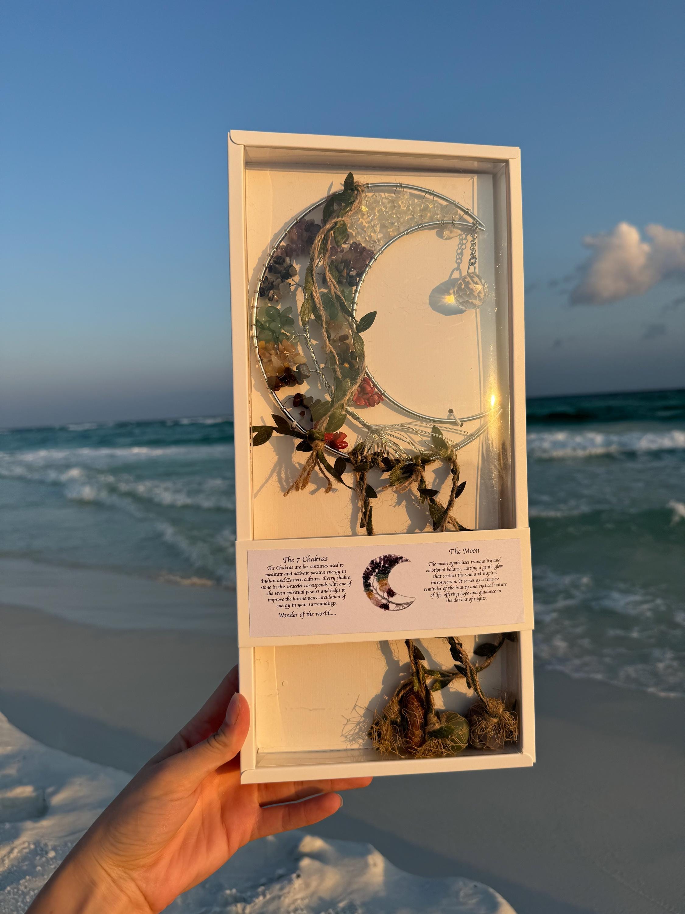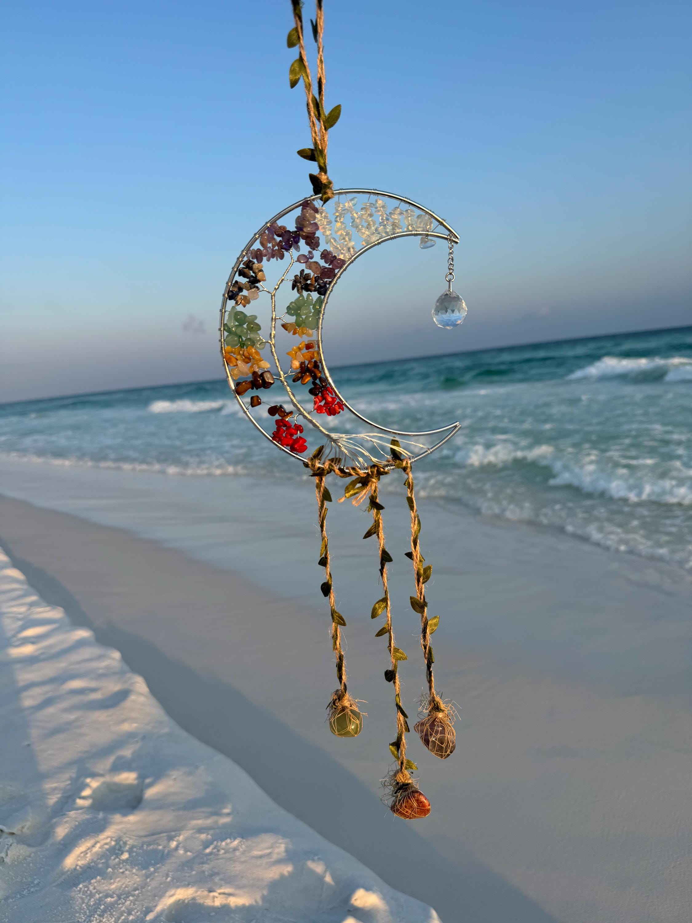 Illuminate your space with this stunning 7 Chakra Gemstone Moon Shaped Suncatcher! Crafted with a crescent moon frame, this piece features a vibrant array of chakra stones— clear quartz, amethyst, lapis lazuli, green adventurine, citrine, tigers eye, and jasper—arranged to align with the seven chakras. Adorned with a clear sun catcher drop and natural accents like dried leaves, it catches the light beautifully, creating a rainbow of healing energies. Perfect for hanging in windows, gardens, or sacred spaces. This suncatcher is ideal for meditation, energy balancing, or as a unique bohemian gift.