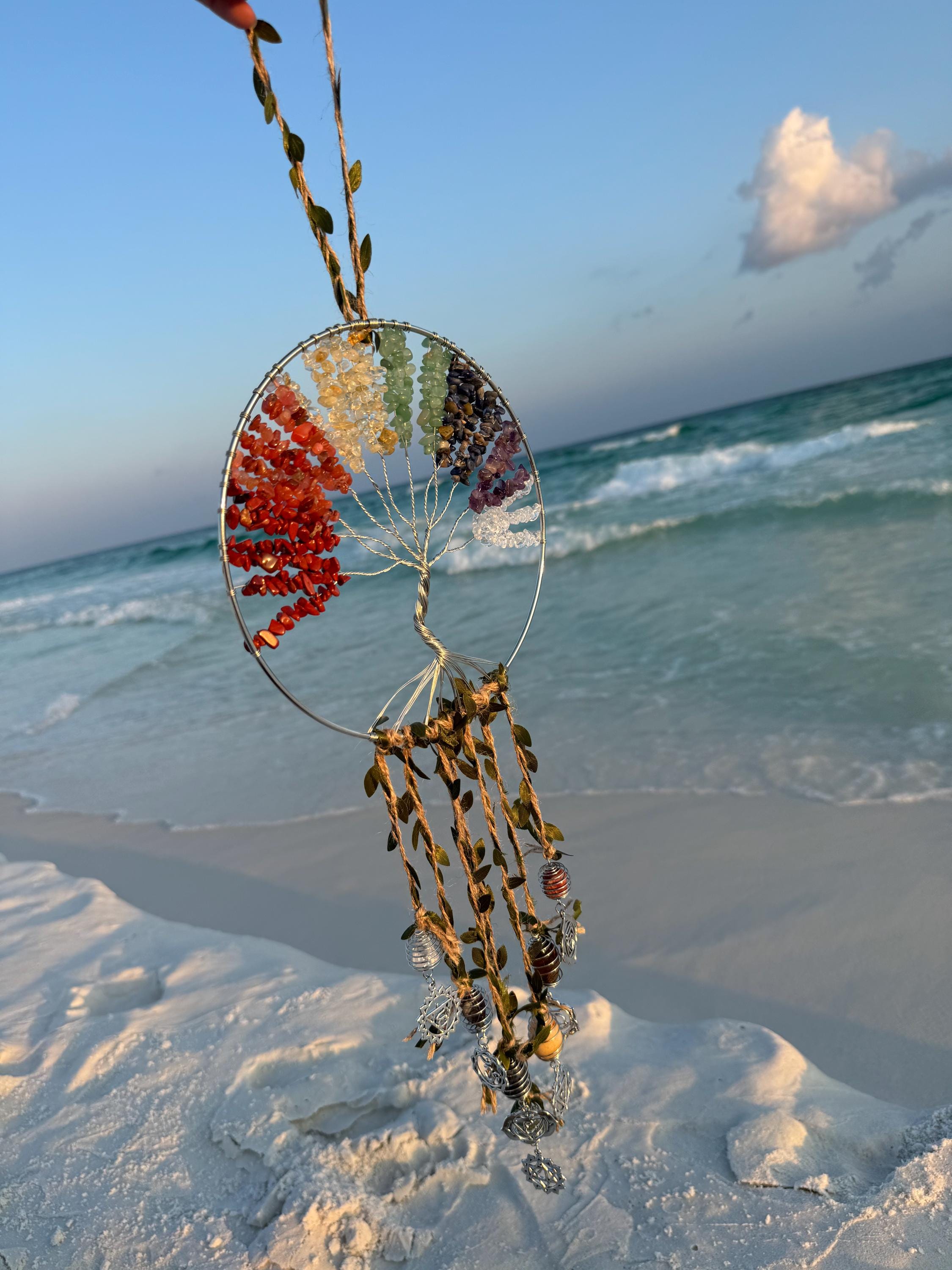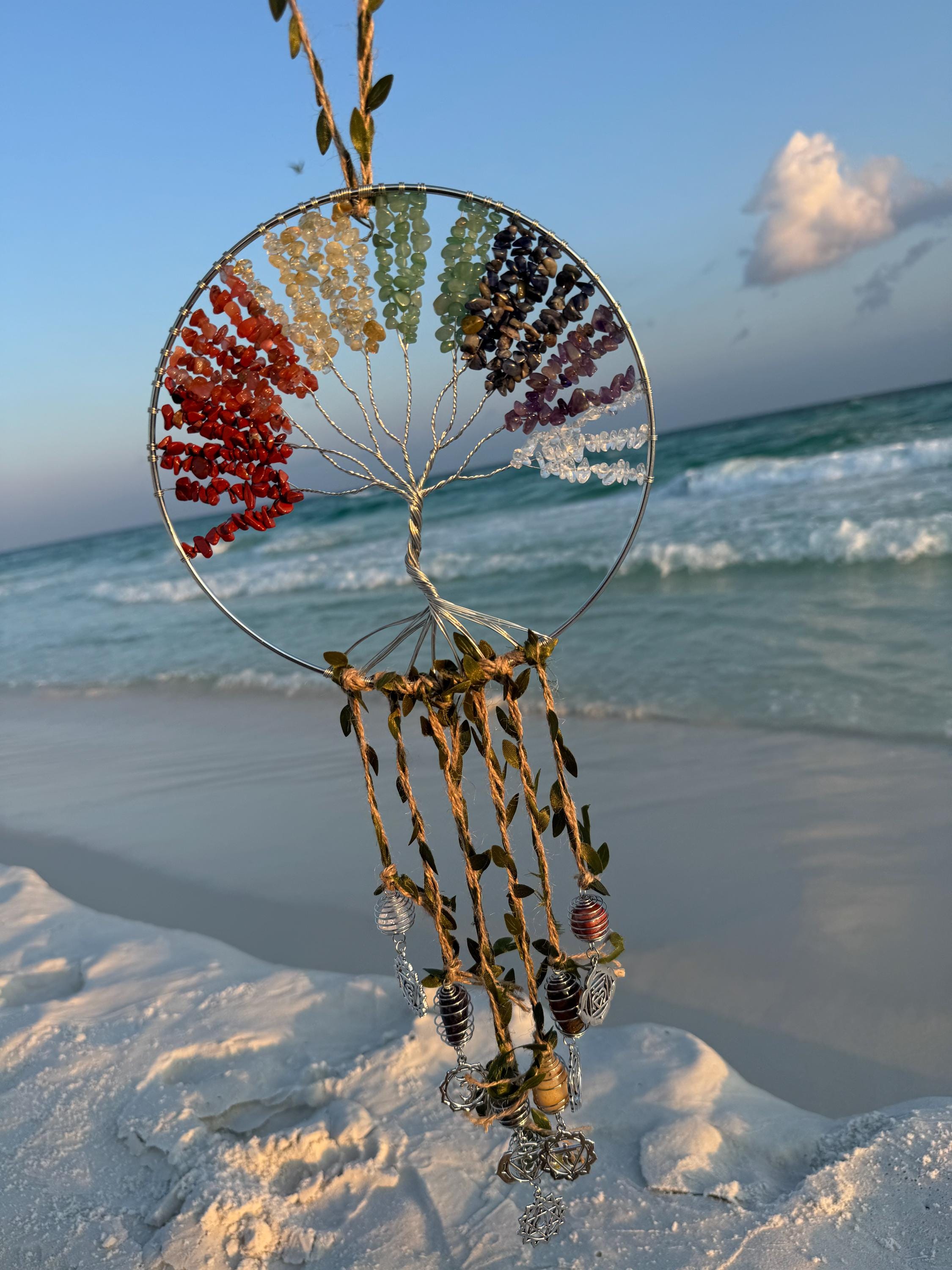 Bring harmony and positive energy to your space with this exquisite 7 Chakra Gemstone Tree of Life Suncatcher! Crafted with a circular frame, this piece features a tree of life design adorned with vibrant chakra stones—red jasper, carnelian, citrine, and more—representing the seven chakras. The dangling strands with additional crystals and natural accents catch the light beautifully, creating a mesmerizing display. Perfect for windows, patios, or meditation areas, this suncatcher is ideal for energy balancing, spiritual decor, or as a unique gift for crystal lovers.