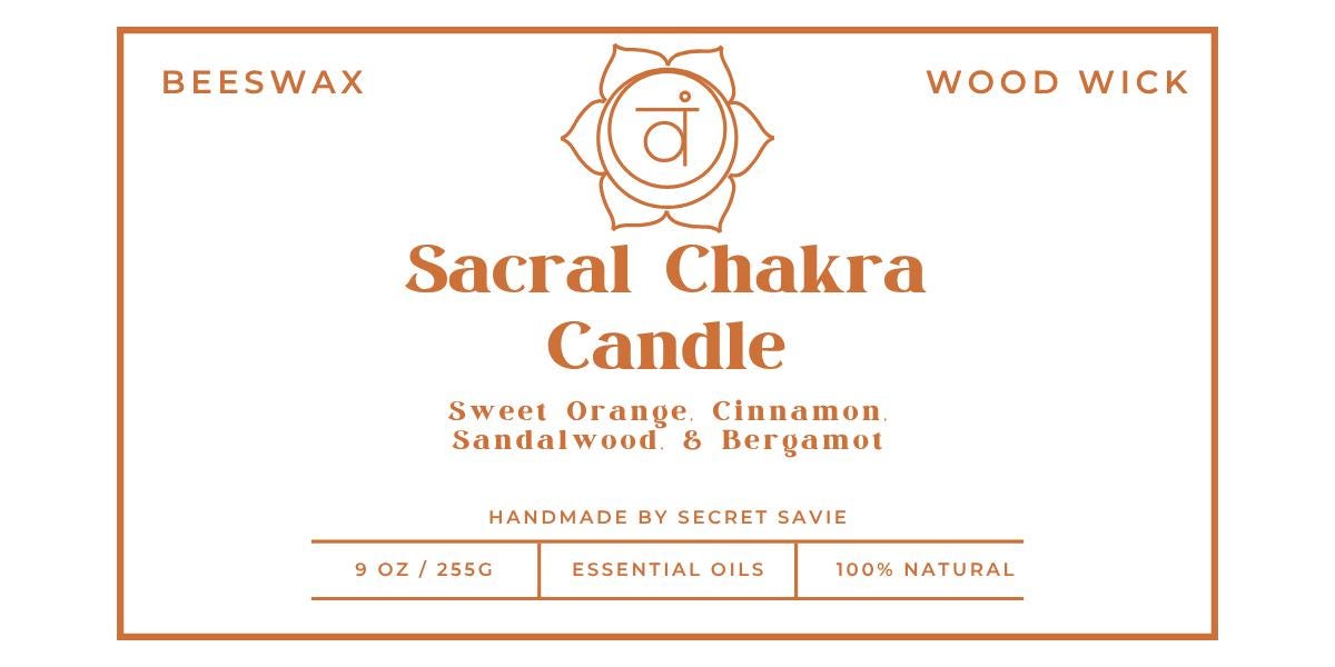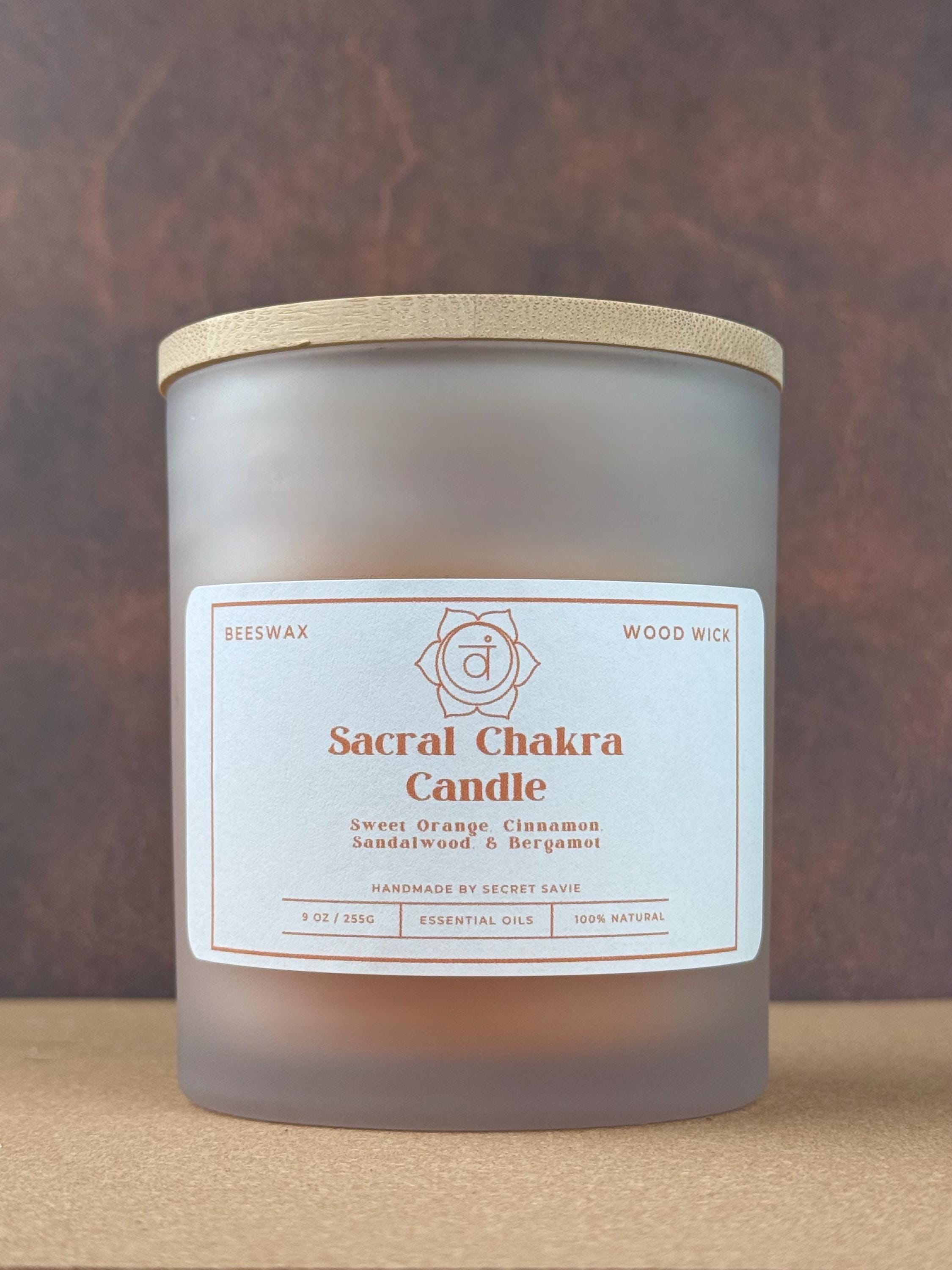 Unleash your creativity and embrace your sensual energy with our **Sacral Chakra Candle**, a handcrafted blend designed to balance your sacral chakra and inspire joy. Made by Secret Savie with 100% pure beeswax and featuring a soothing wood wick, this candle is infused with a vibrant mix of essential oilsâSweet Orange, Cinnamon, Sandalwood, and Bergamotâdelivering a warm, citrusy aroma that sparks passion and emotional flow. Decorated with radiant calendula petals, it adds a touch of natural beauty and healing to your sacred space.