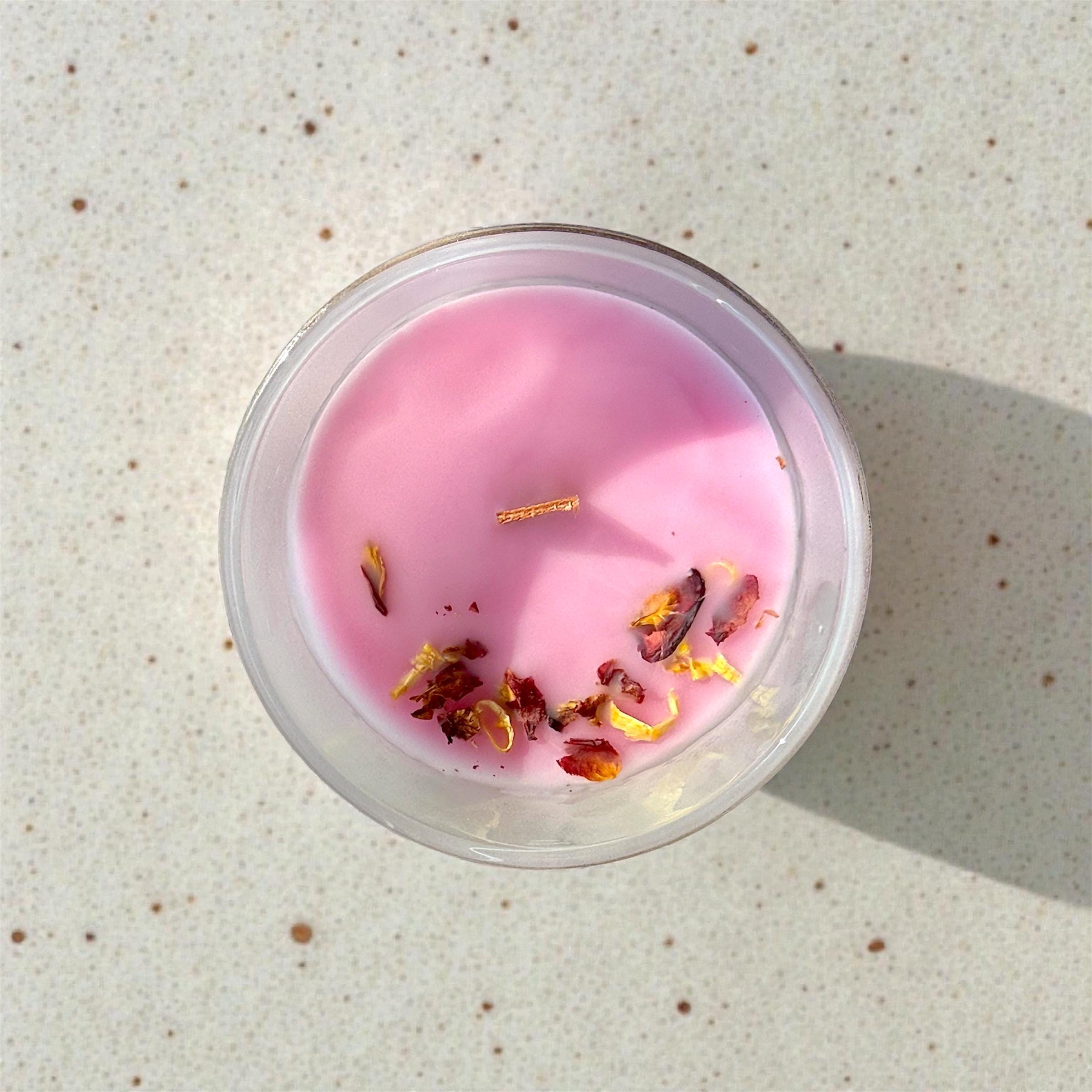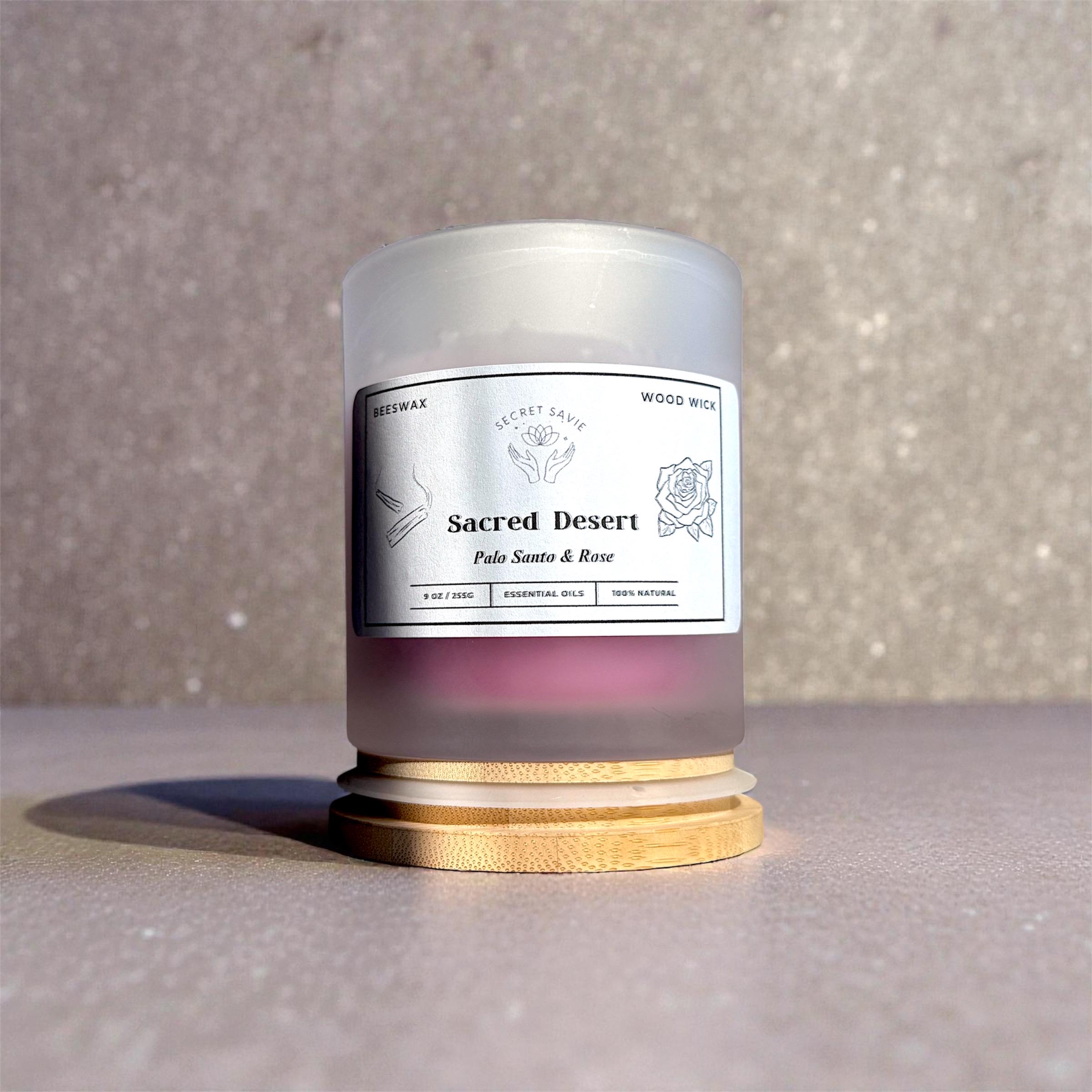 Transport yourself to a tranquil desert oasis with our Sacred Desert Palo Santo & Rose Beeswax Candle! This 9 oz (255g) frosted jar gem, infused with 100% natural essential oils, features a soothing wood wick that crackles like a desert campfire. Hand-poured with love, its delicate palo santo and rose blend evokes a serene, earthy escape, perfect for meditation or unwinding after a long day. Topped with rose petals, adorned with minimalist palo santo stick and rose illustrations, this candle is a must-have for nature lovers and spiritual seekers alike. Light it up and let the sacred vibes flow!