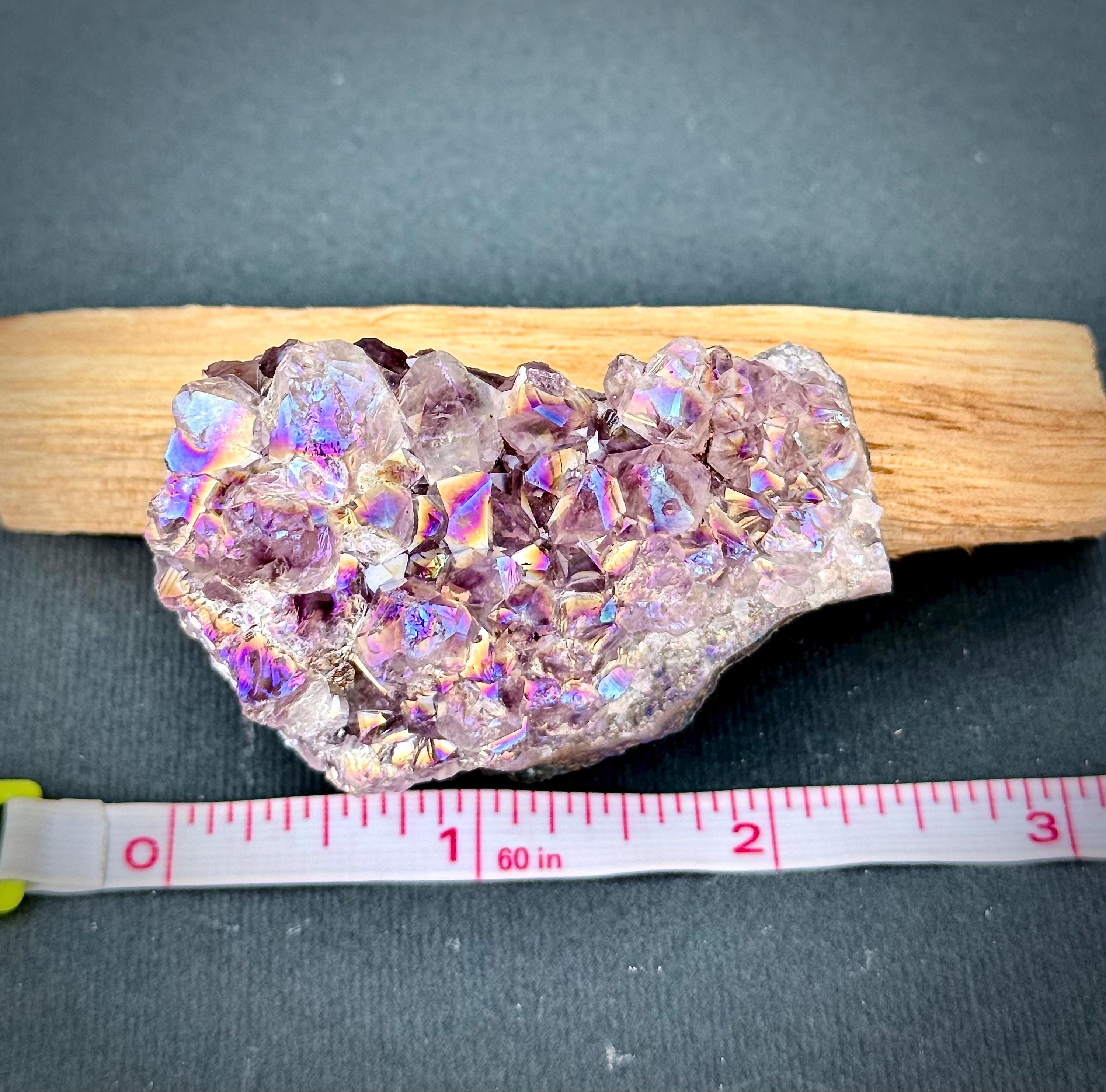 Unleash the magic of this breathtaking iridescent aura quartz crystal, a dazzling masterpiece with its vibrant purple hue and mesmerizing rainbow reflections! Measuring around 2.5 inches, this hand-selected gem is a captivating addition to your collection, perfect for elevating your meditation, energy work, or simply as a stunning decor statement.