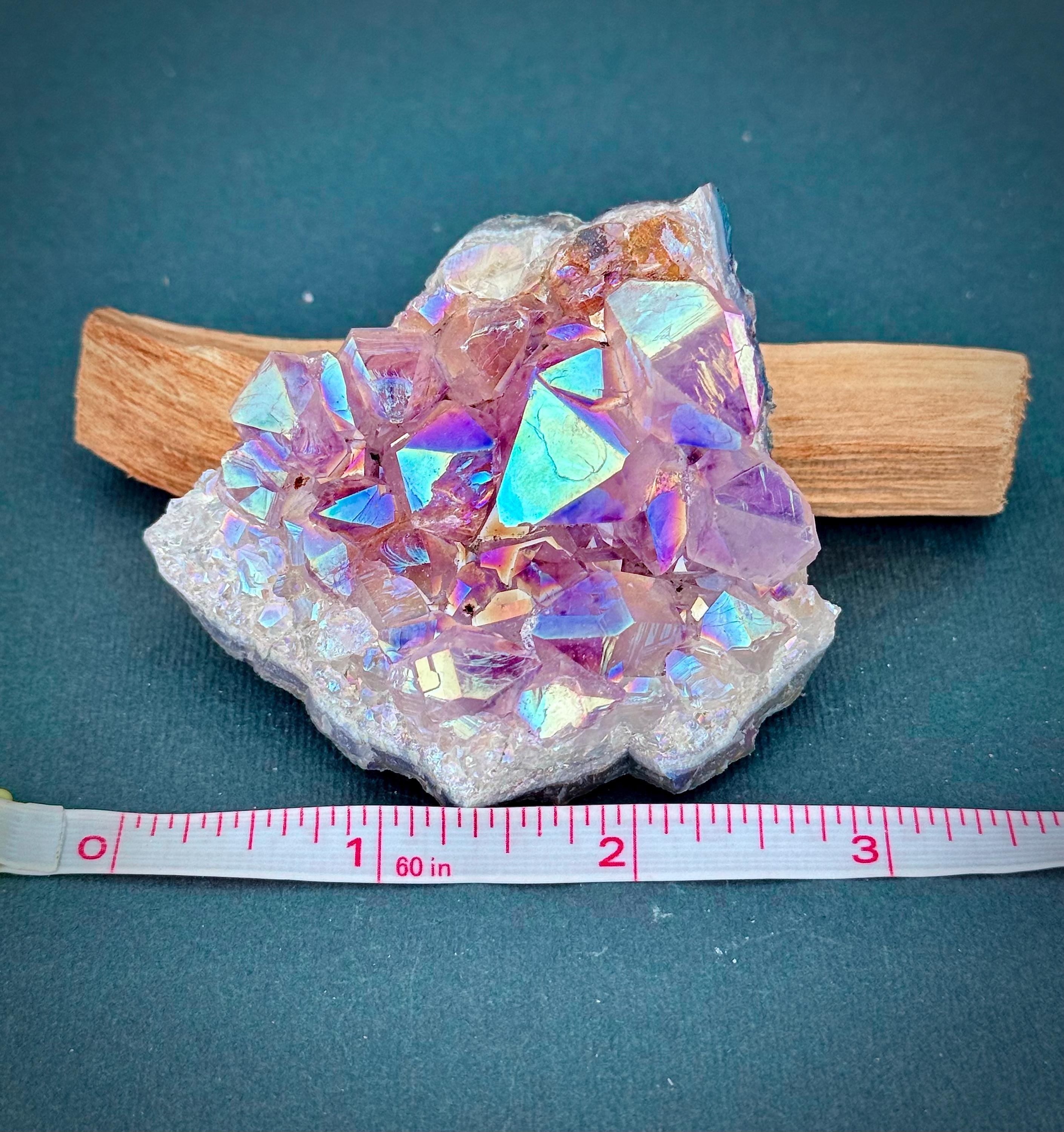 Unleash the magic of this breathtaking iridescent aura quartz crystal, a dazzling masterpiece with its vibrant purple hue and mesmerizing rainbow reflections! Measuring around 3 inches, this hand-selected gem is a captivating addition to your collection, perfect for elevating your meditation, energy work, or simply as a stunning decor statement.