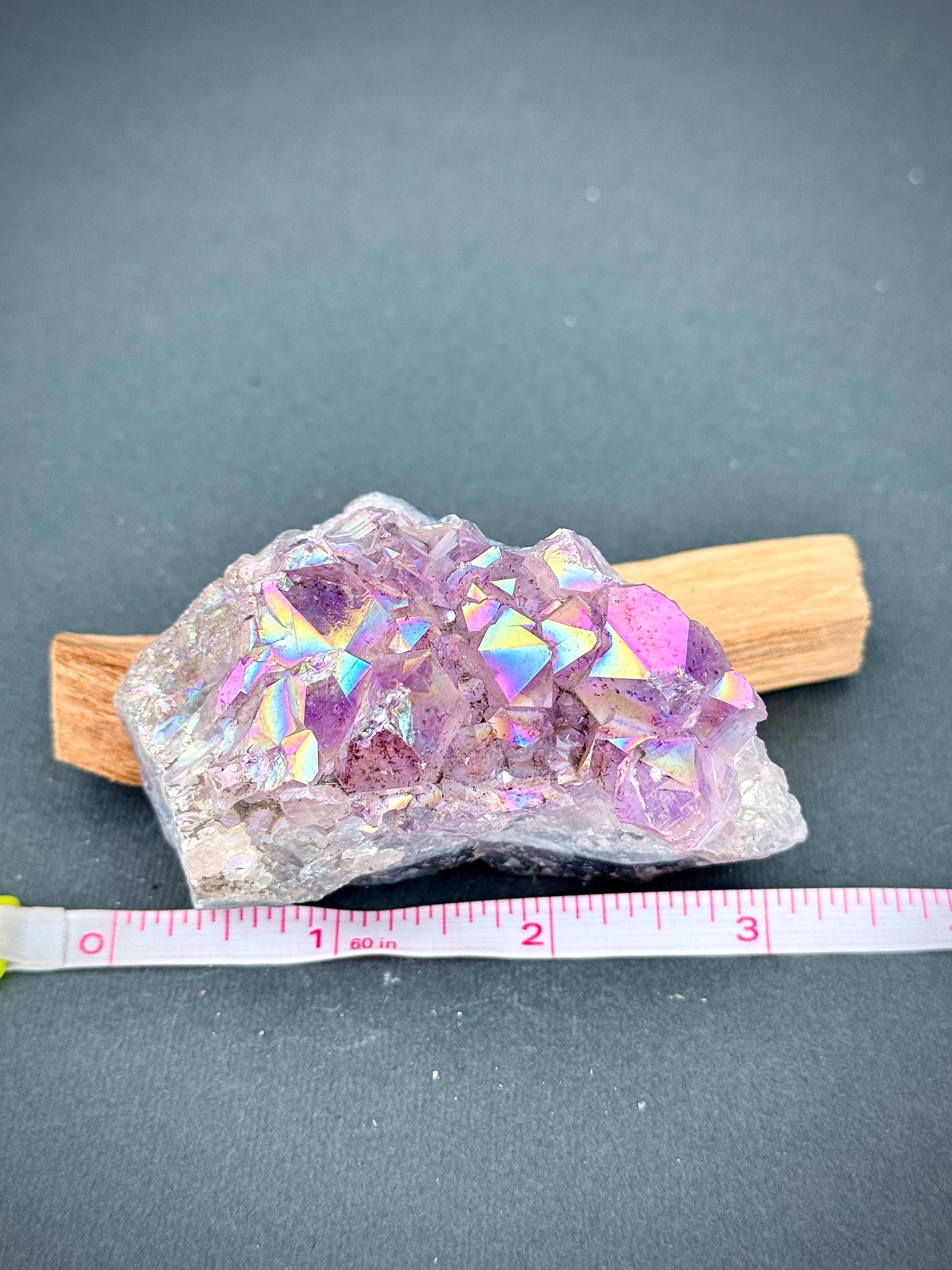 Unleash the magic of this breathtaking iridescent aura quartz crystal, a dazzling masterpiece with its vibrant purple hue and mesmerizing rainbow reflections! Measuring around 3 inches, this hand-selected gem is a captivating addition to your collection, perfect for elevating your meditation, energy work, or simply as a stunning decor statement.