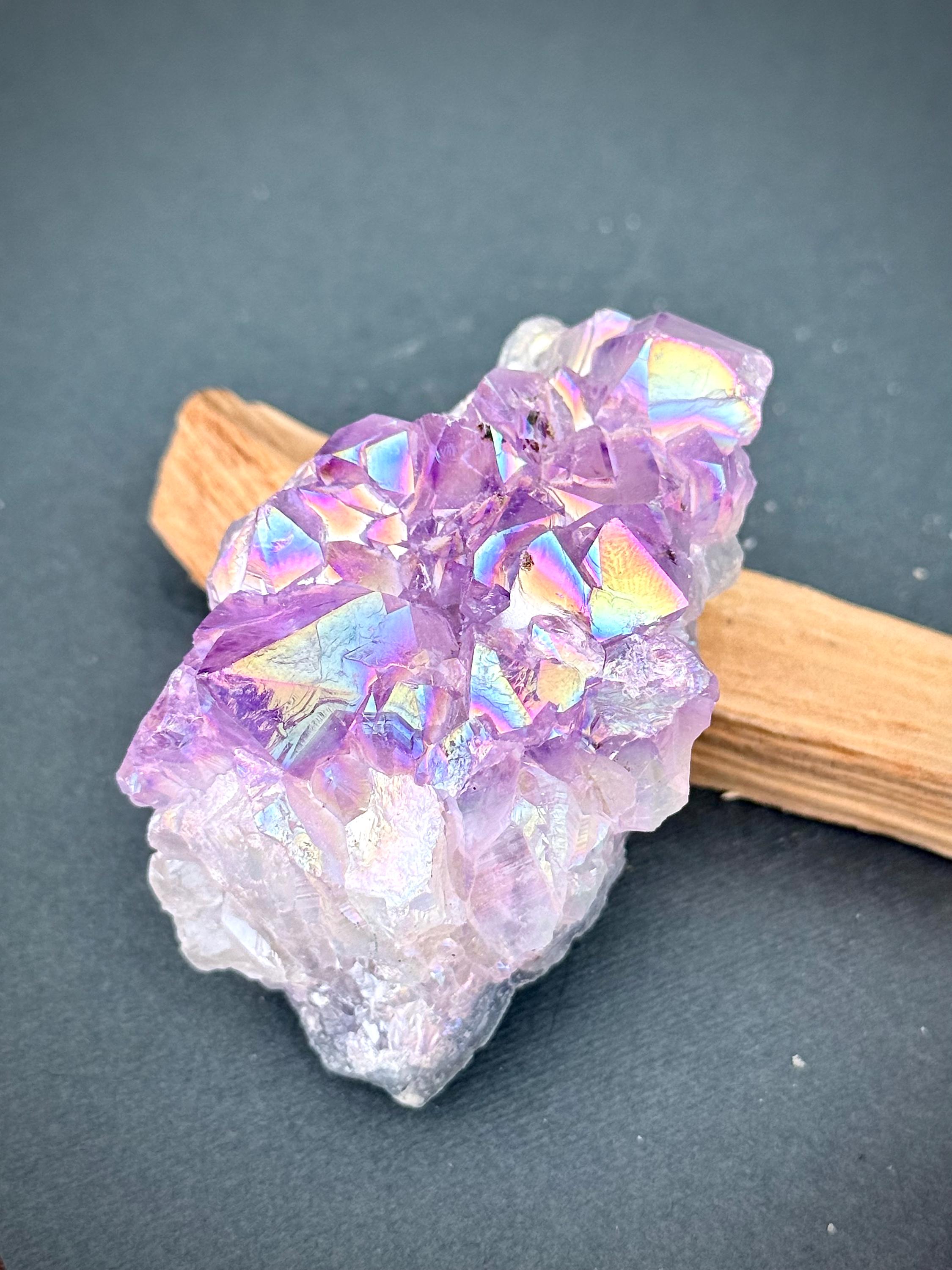 Unleash the magic of this breathtaking iridescent aura quartz crystal, a dazzling masterpiece with its vibrant purple hue and mesmerizing rainbow reflections! Measuring around 2 inches, this hand-selected gem is a captivating addition to your collection, perfect for elevating your meditation, energy work, or simply as a stunning decor statement.