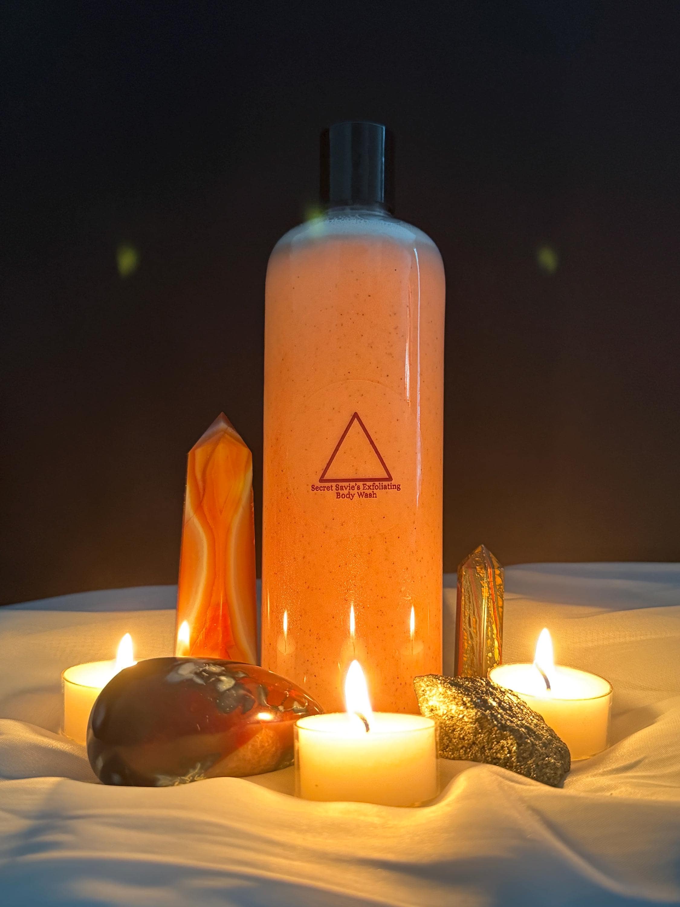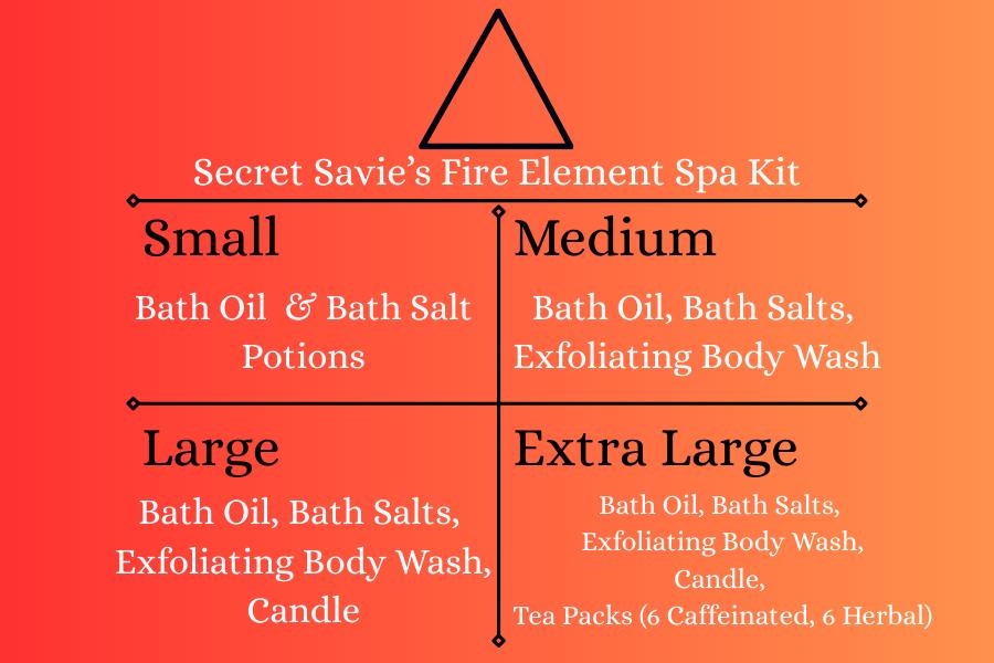 • Everything in the Small Kit + Fire Element Exfoliating Body Wash (16oz) : A luxurious gel-based wash with apricot seed powder for gentle exfoliation, blended with olive oil, castor oil, and the signature essential oil blend, enhanced with red gold mica for a subtle shimmer. Cleanses and revitalizes skin with a fiery glow.