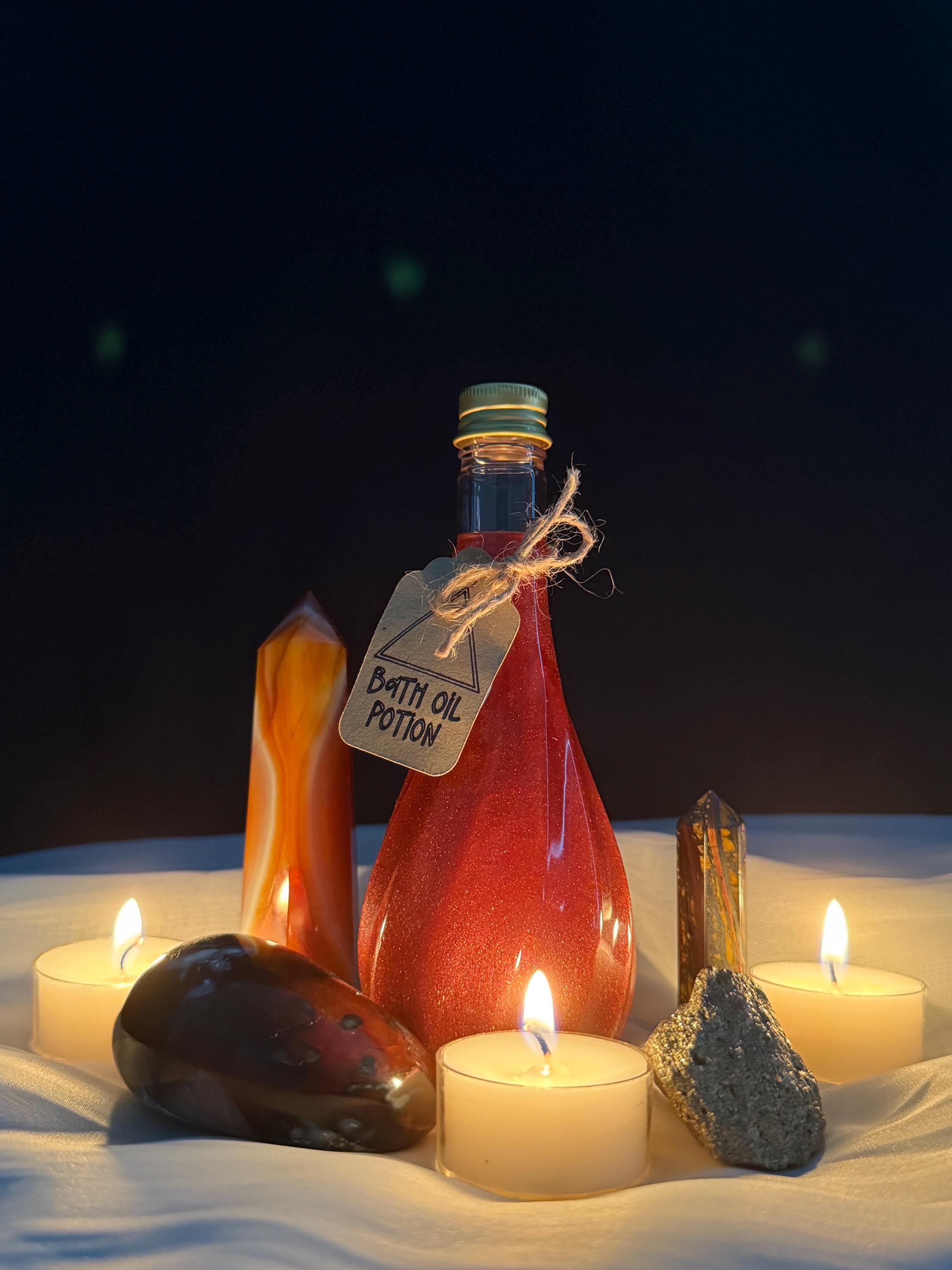 • Fire Element Bath Oil (5oz) : A nourishing blend of apricot seed oil, jojoba oil, coconut oil, sweet almond oil, and essential oils of rose, sandalwood, sweet orange, and ylang ylang. Moisturizes skin while enveloping you in a fiery aroma.