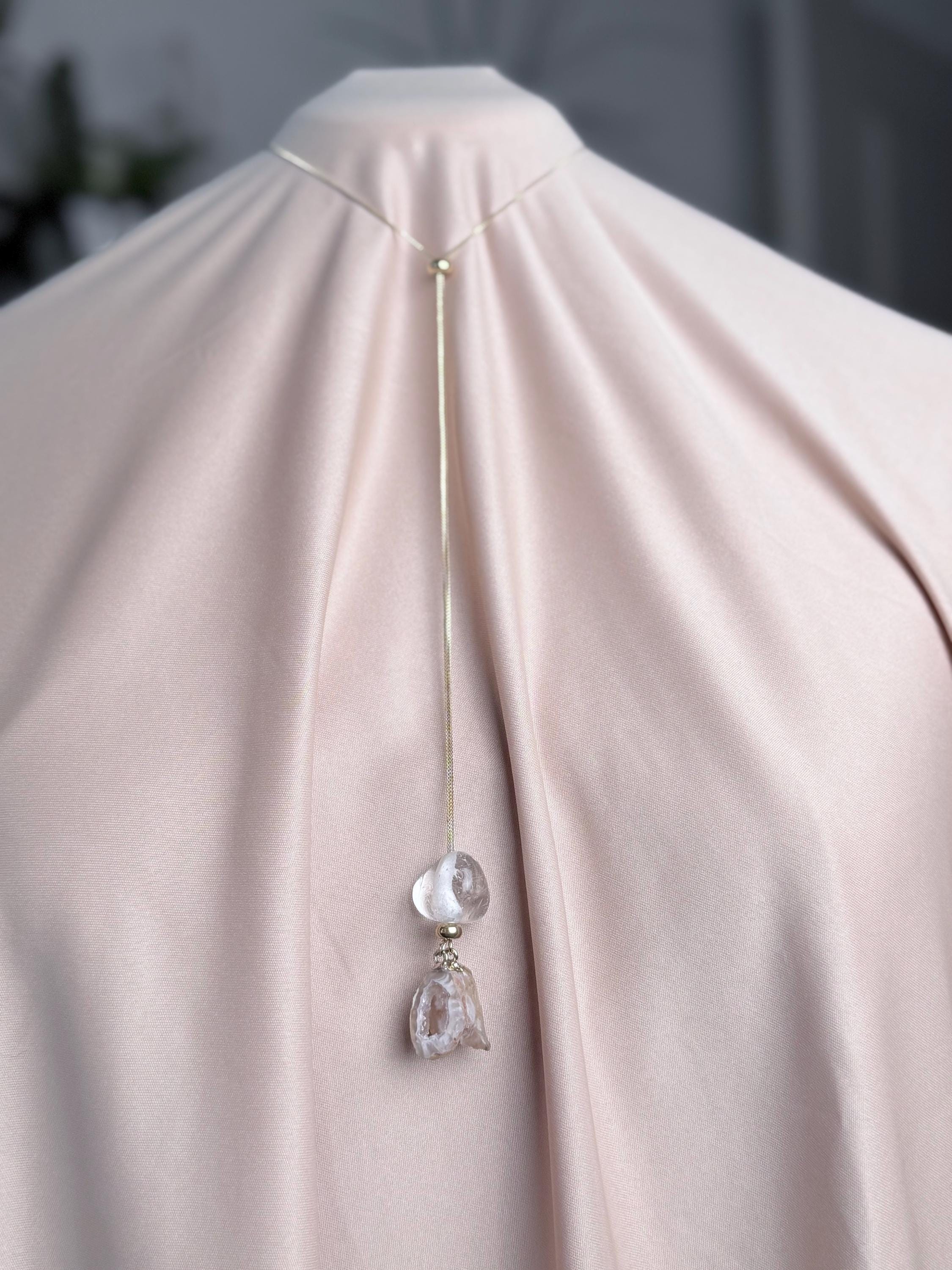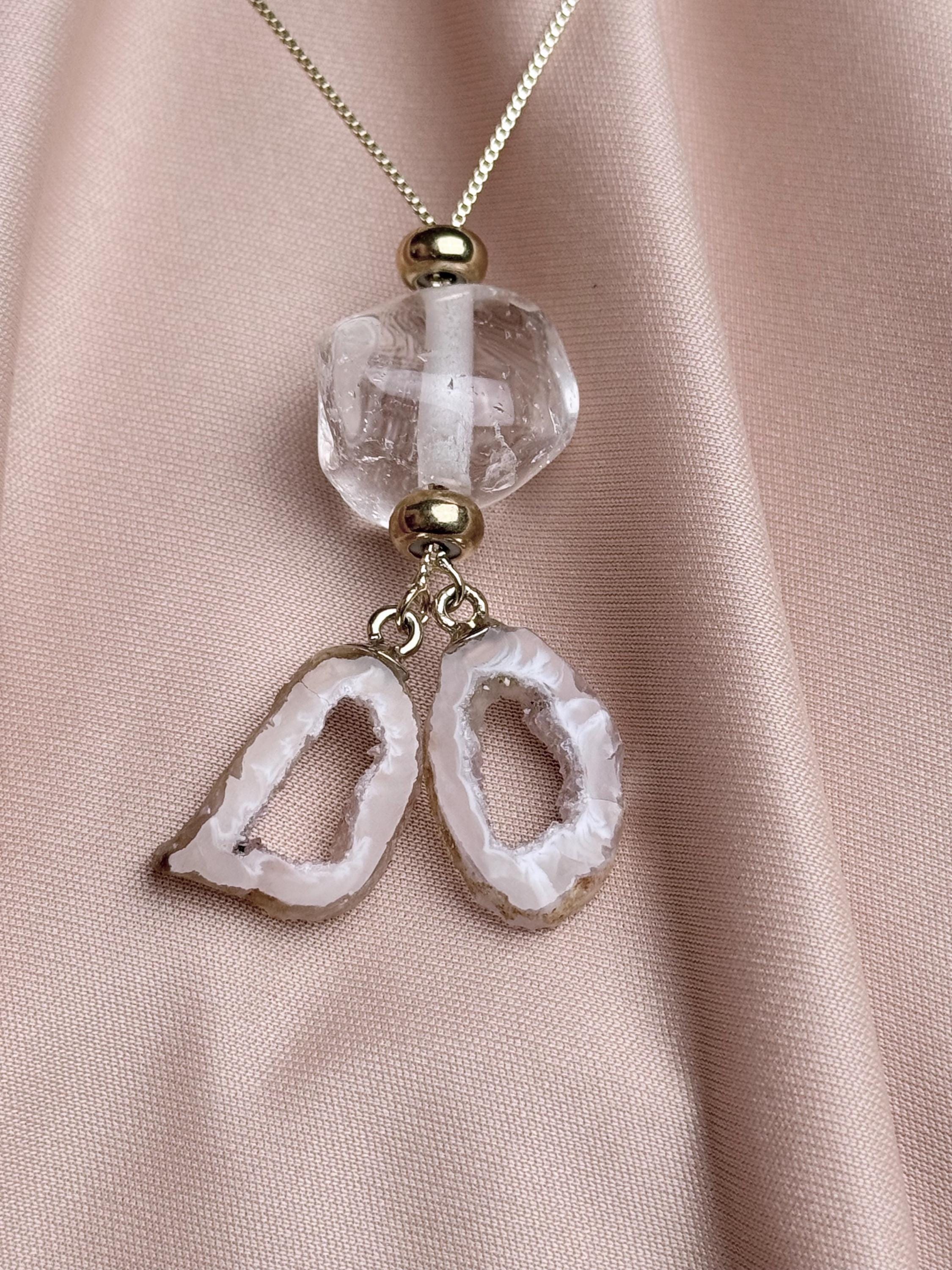 The design is light and feminine: a sparkling clear quartz crystal floats above two translucent geode slices that catch and scatter light with every movement, creating an ethereal, almost angelic glow. Wear it high as a choker or longer for effortless layering.