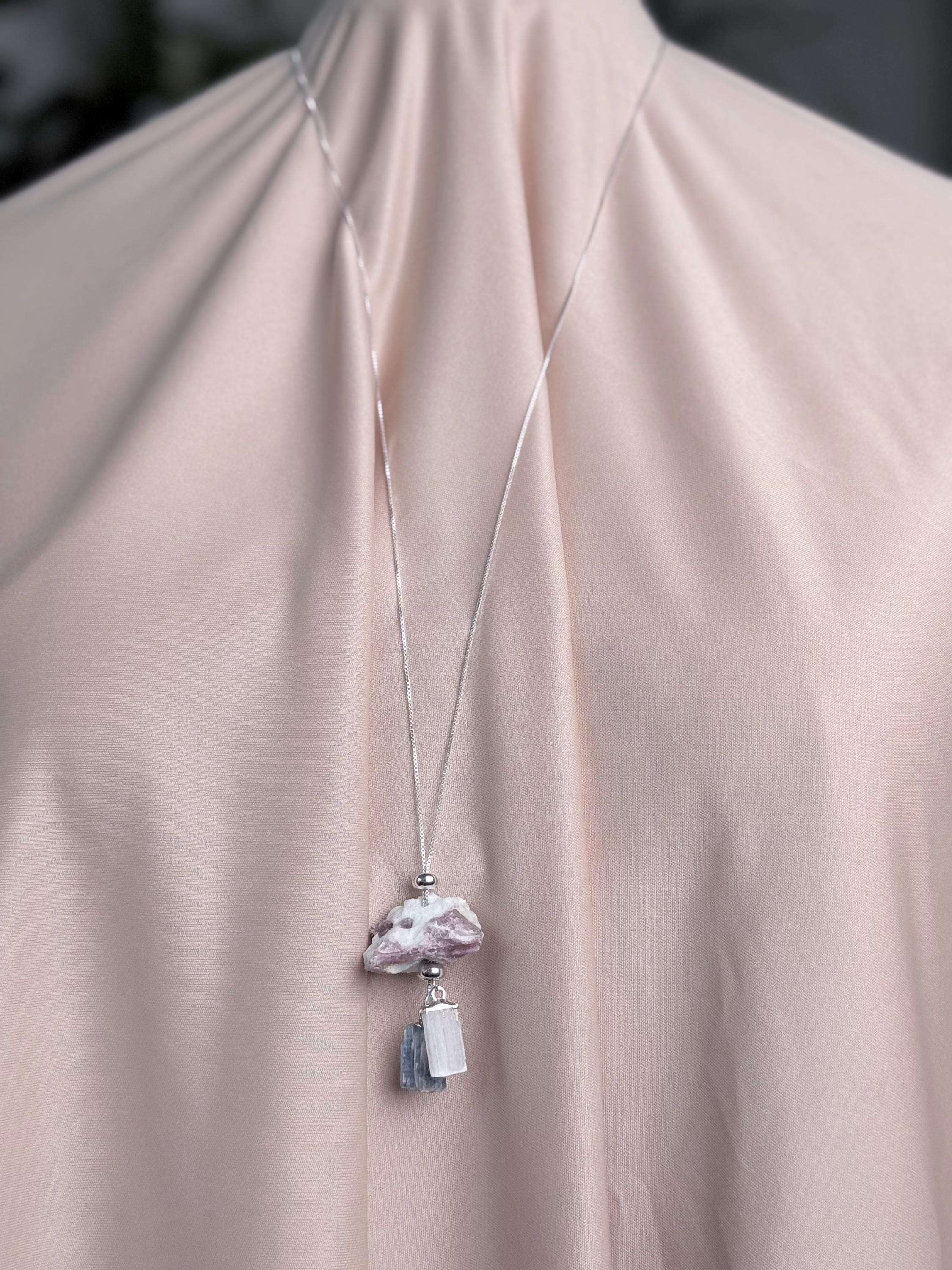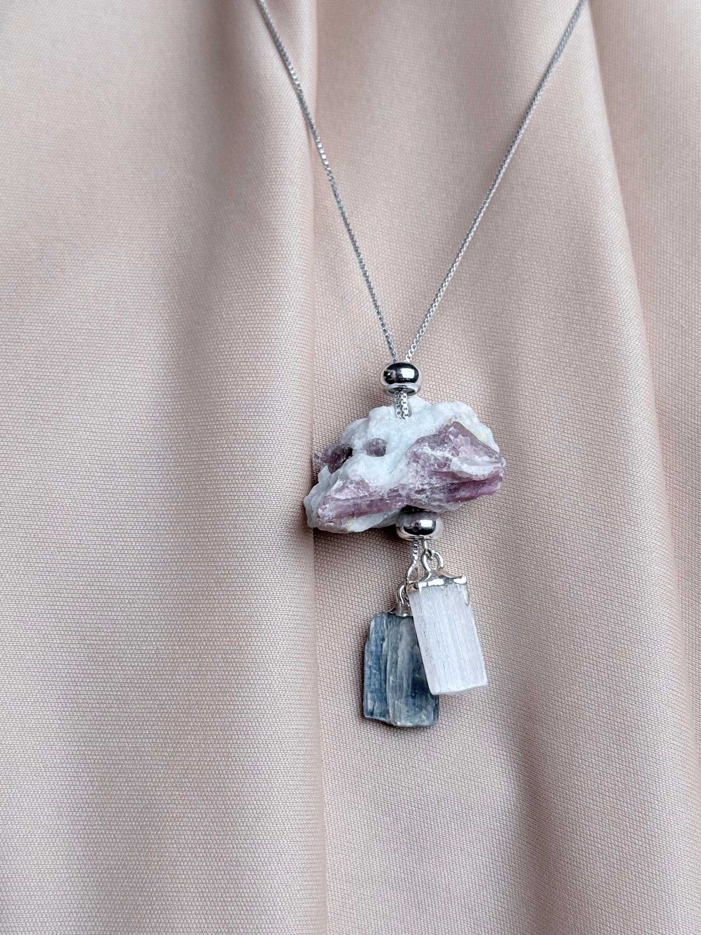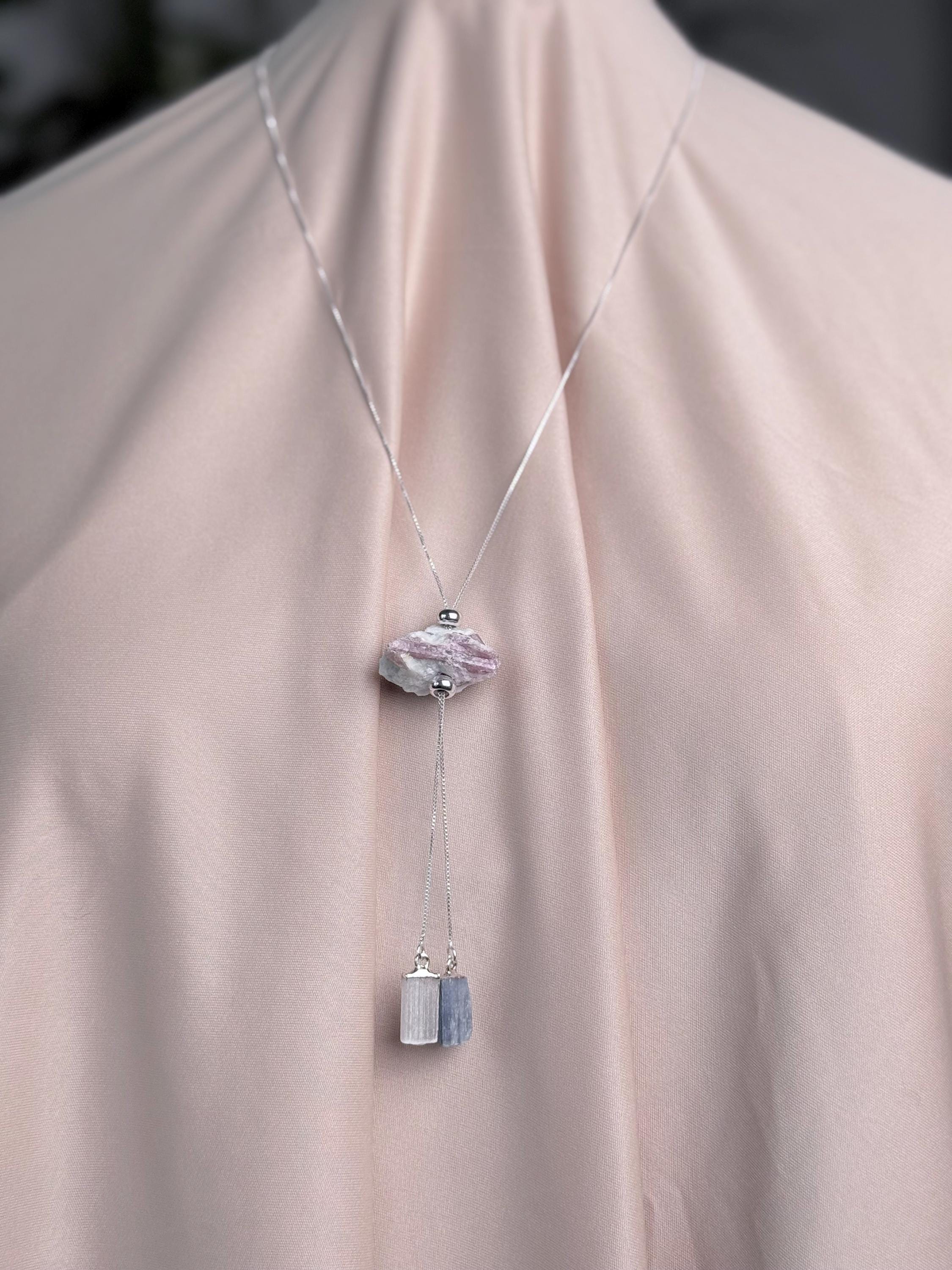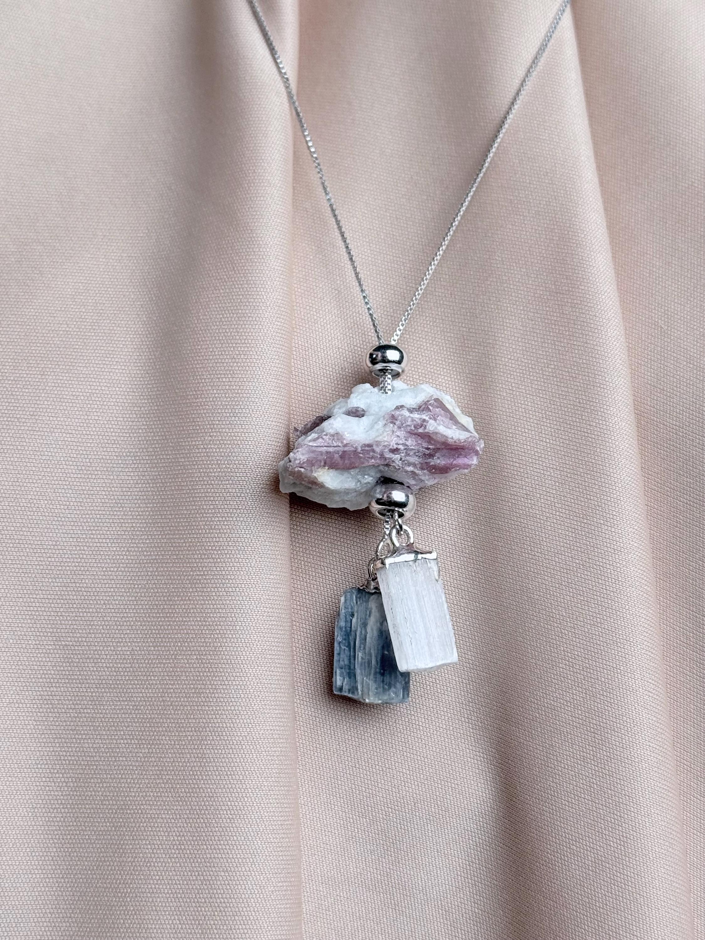 Soft power meets celestial clarity — this dreamy adjustable necklace combines a raw pink tourmaline (rubellite) crystal still nestled in its natural quartz-lepidolite matrix, with two dangling mini wands of pure selenite and blue kyanite.