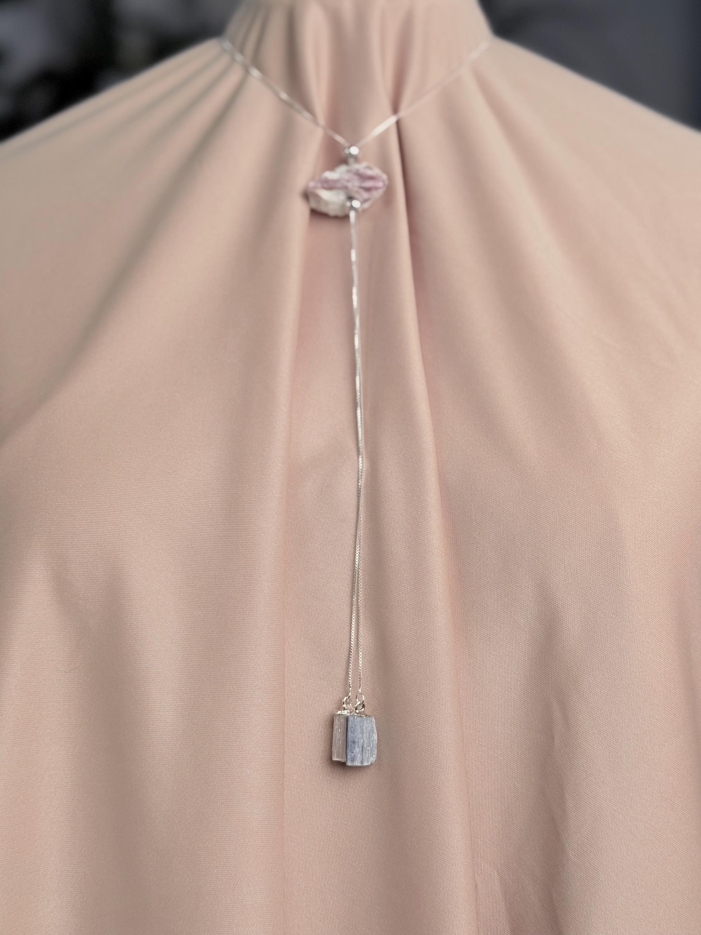 The design is delicate yet potent: the pastel pink-lavender tourmaline bar floats horizontally at the top, while the selenite and kyanite dangle below, gently swaying with your heartbeat. Wear it short as a choker or longer for layering.