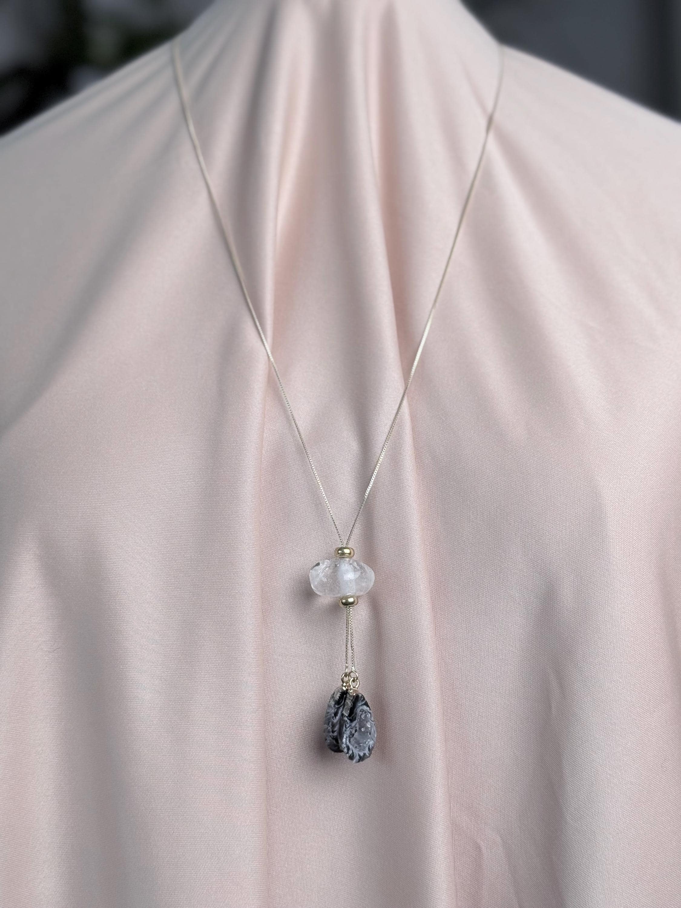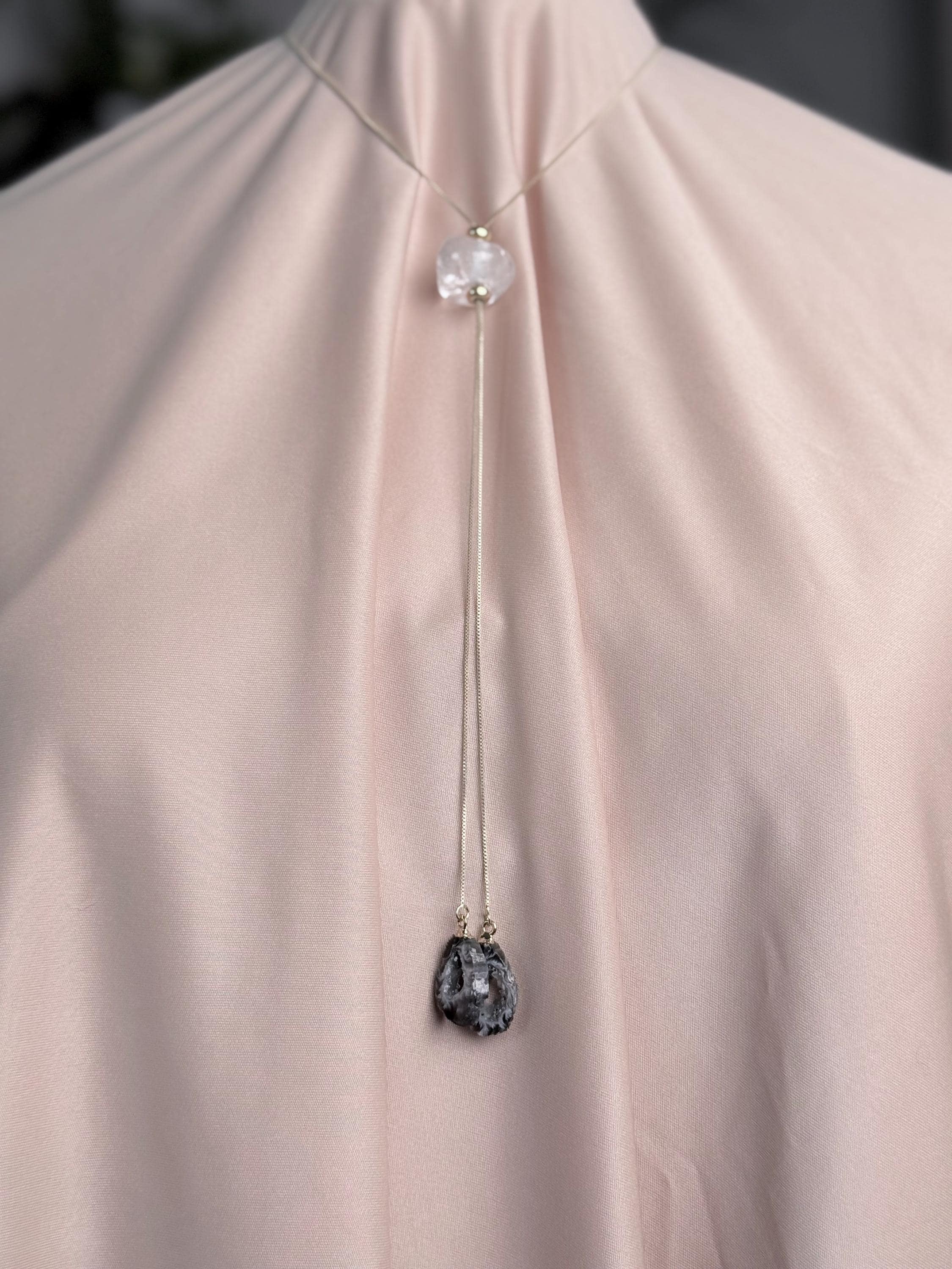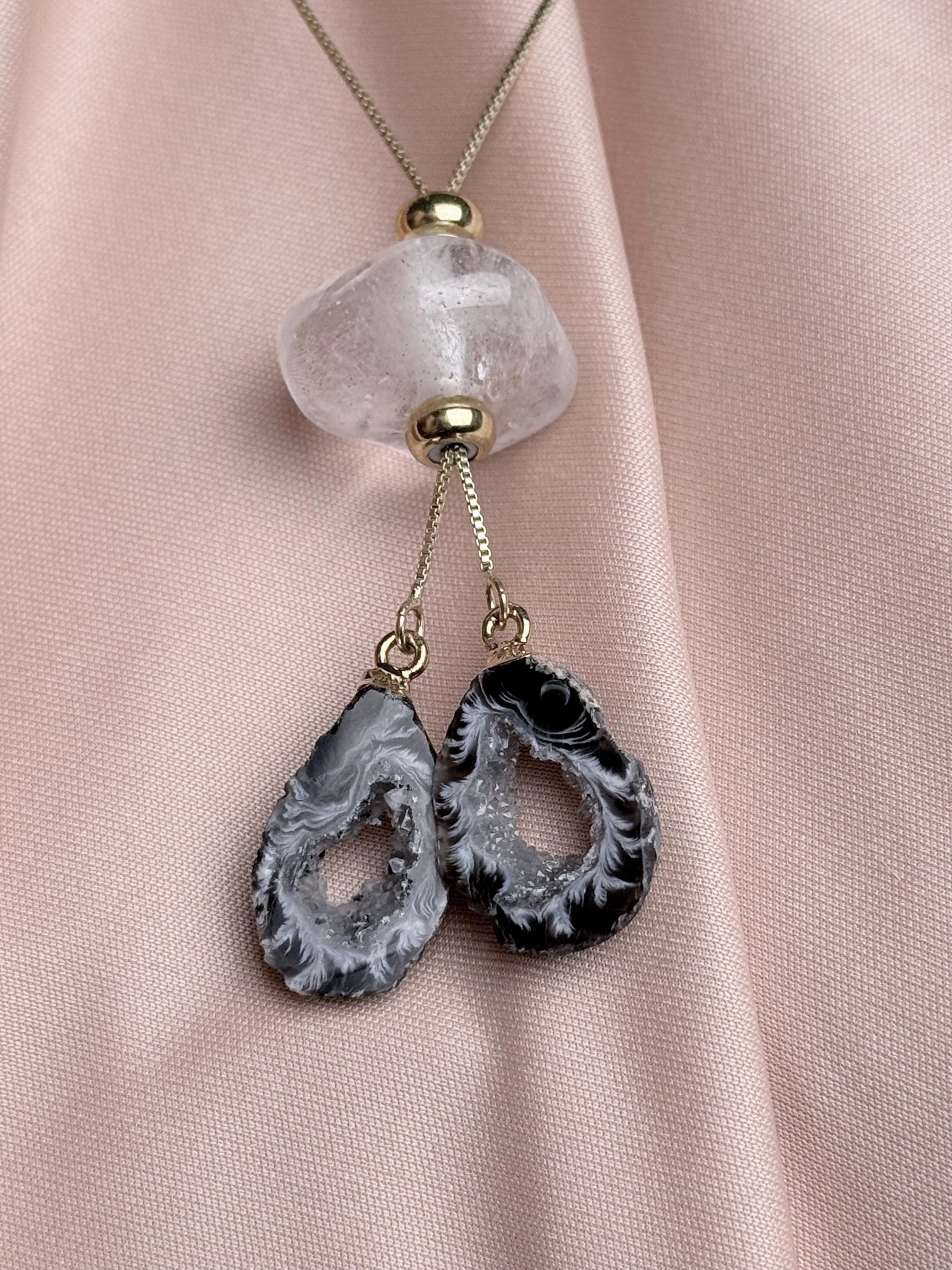 Because these are completely natural geode slices and raw quartz, every necklace is 100% unique. No two stones are exactly alike — expect slight variations in color (black, cream, grey), pattern, translucency, druzy sparkle, and natural formations. Your piece will be one-of-a-kind and may differ subtly from the photos while keeping the same gentle, high-vibe aesthetic.