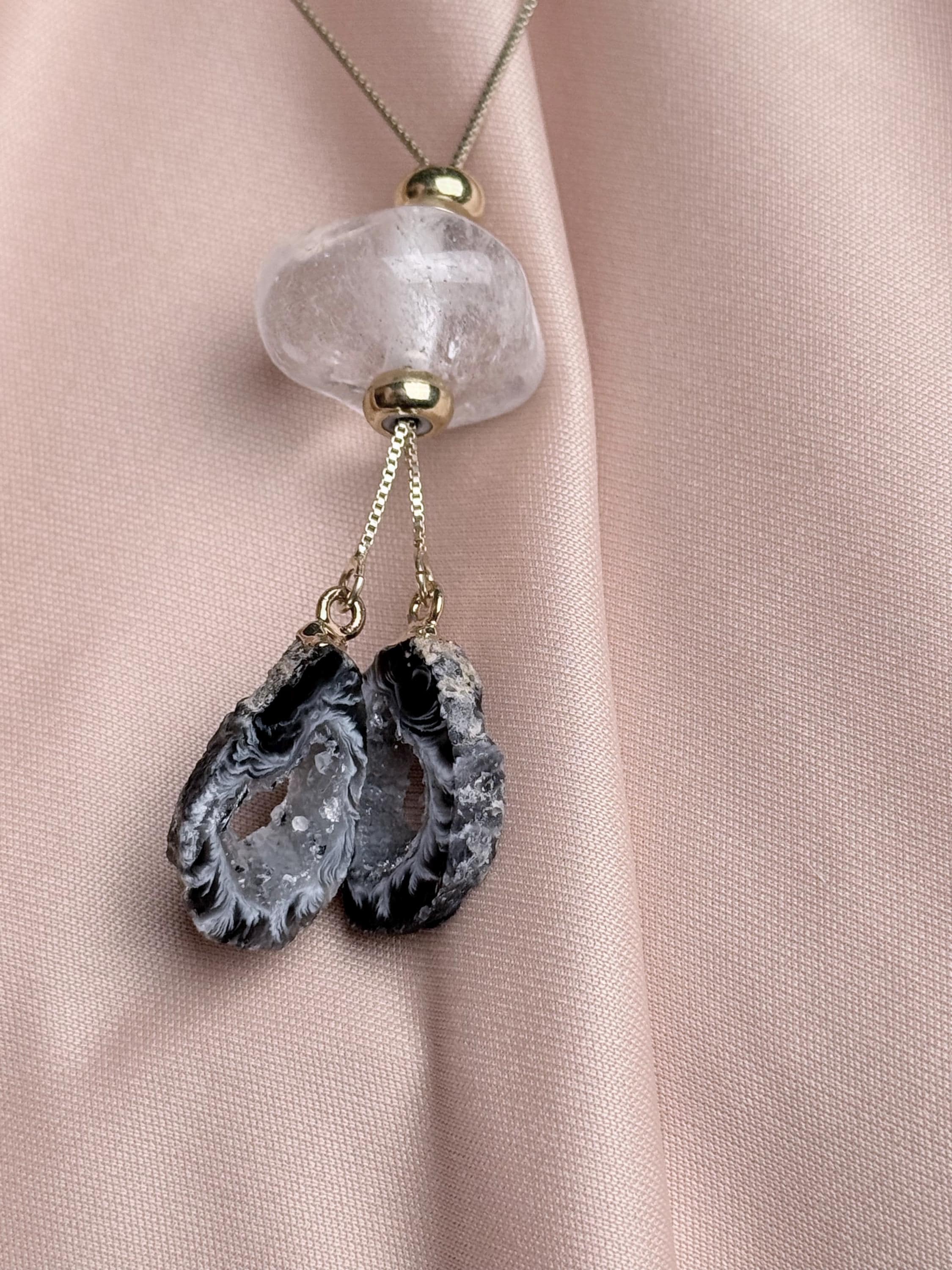 The design is light and feminine: a sparkling clear quartz crystal floats above two translucent geode slices that catch and scatter light with every movement, creating an ethereal, almost angelic glow. Wear it high as a choker or longer for effortless layering.