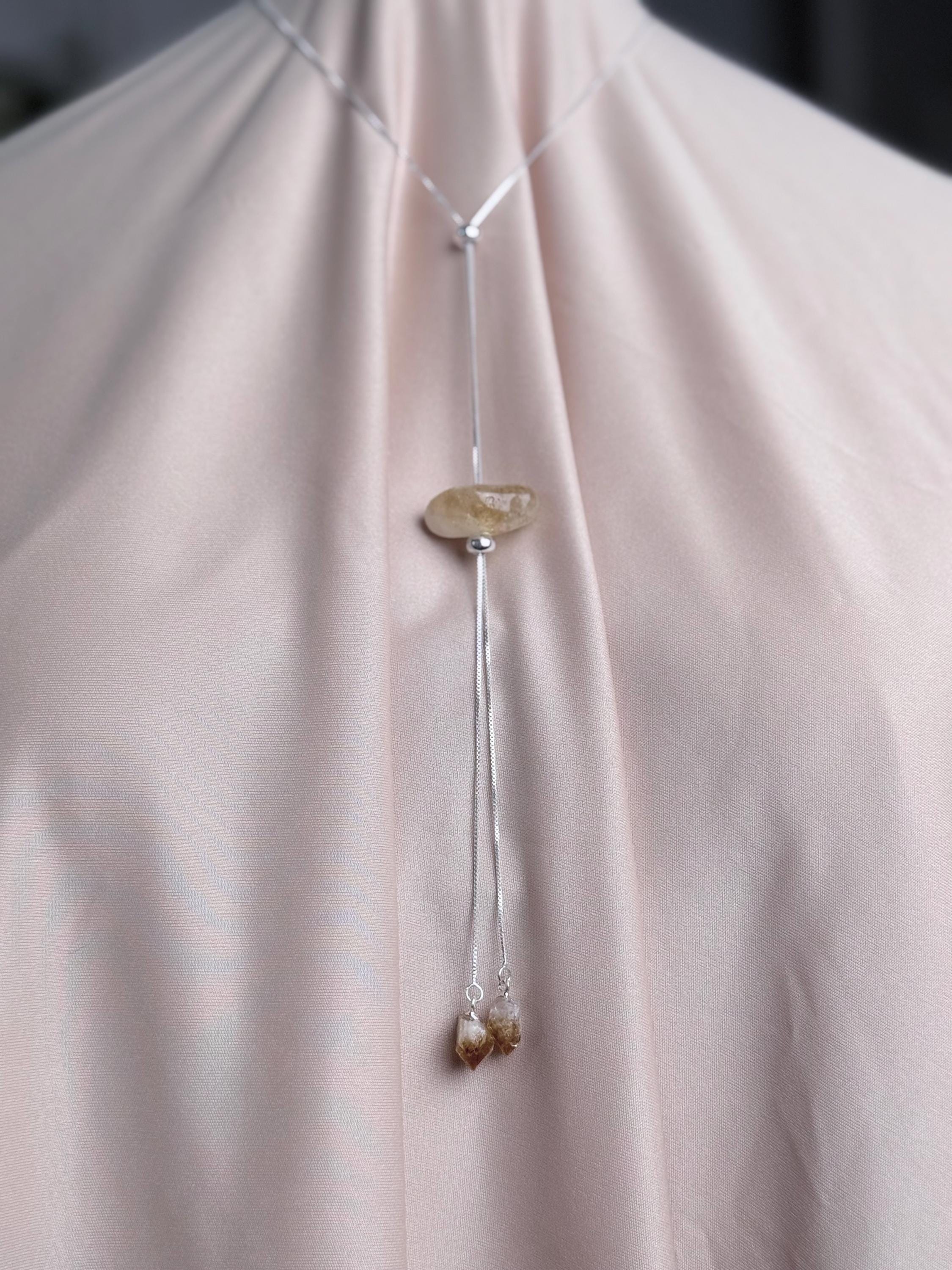 The design is simple, radiant, and full of movement: a polished-yet-raw horizontal citrine bar sits at the top, while two rough citrine points dangle below, catching light and sparkling with every breath. Wear it short as a choker or longer for easy layering.